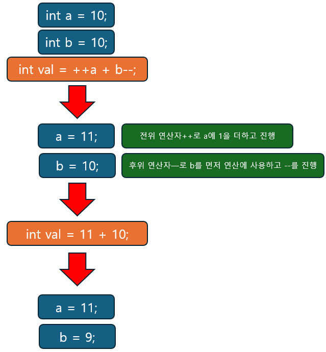 위 코드에서 int val = ++a + b--; 는 다음과 같이 진행된다.int a = 10; int b = 10; int val = ++a + b--;