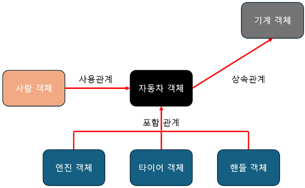 - 포함관계 : '엔진 객체', '타이어 객체', '핸들 객체'는 '자동차 객체'에 포함