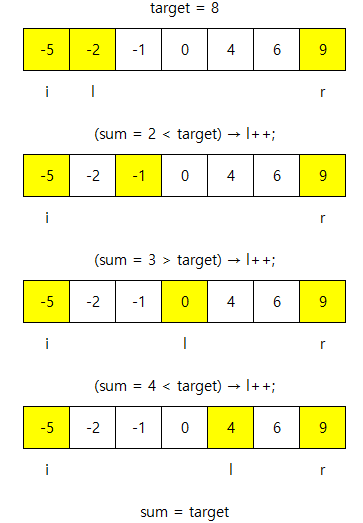 - 1차원 배열에서 각 다른 원소를 가르키는 2개의 포인터를 조작해가면서 원하는 값을 탐색하는 알고리즘이다.