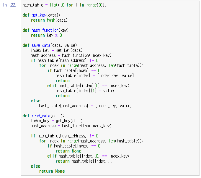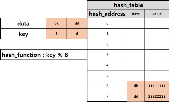 - 충돌이 일어나면, 해당 hash address의 다음 address부터 맨 처음 나오는 빈공간에 저장하는