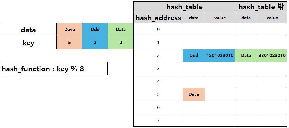 - 여러 키에 해당하는 주소가 동일할 경우 충돌을 해결하기 위한 별도 자료구조가 필요함