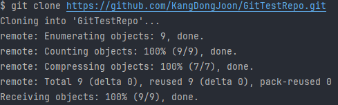 1. git clone : 현재 위치에 원격저장소 내용 복사해오기(https://djhelloworld.tistory.com/124 에서 push한 내용을 가져옴)
