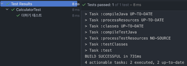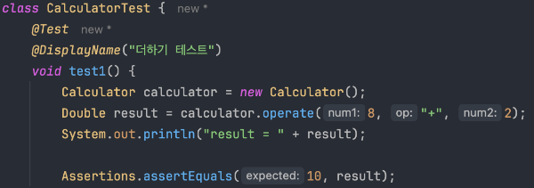 - Assertions.assertEquasl(a,b)를 통해 예상값a가 기대값b와 일치하는지 확인한다.