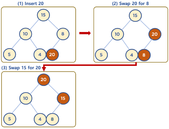 □ 힙에 데이터 삽입하기 - 삽입할 데이터가 힙의 데이터보다 클 경우(Max Heap의 예)
