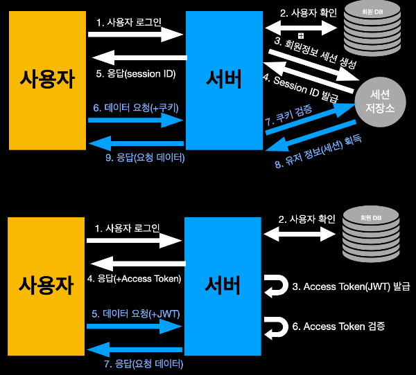 | 설명 | 클라이언트에 저장될 목적으로 생성한 작은 정보를 담은 파일 | 서버에서 일정시간 동안 클라이언트 상태를 유지하기 위해 사용 |