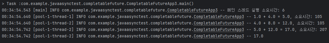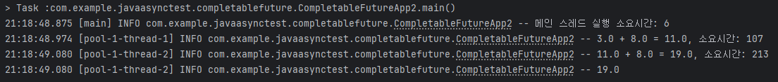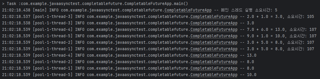 - completableFuture이 비동기로 실행전달하고 메인 스레드가 먼저 실행됨