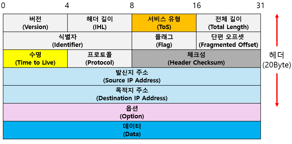 헤더 크기 | 가변길이(20~60바이트) | 40바이트 고정 |
