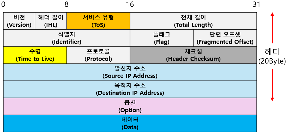 - IP : 데이터 패킷의 주소 지정 및 전살(비신뢰성, 비연결성)