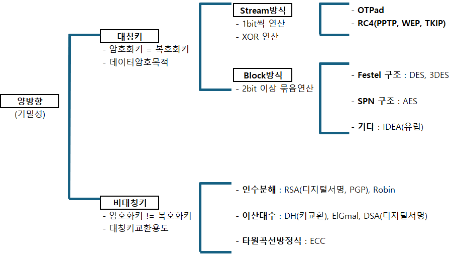 - 블록 암호화 : DES, AES, IDEA, SEED, CRYPTON, ARIA, HIGHT, RC5
