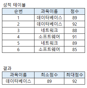 16. 다음 성적 테이블에서 과목별 점수의 평균이 90점 이상인 '과목이름', '최소점수', '최대점수' 를 검색하고자 한다. [조건]을 참고하여 적합한 SQL문을 작성하시오.