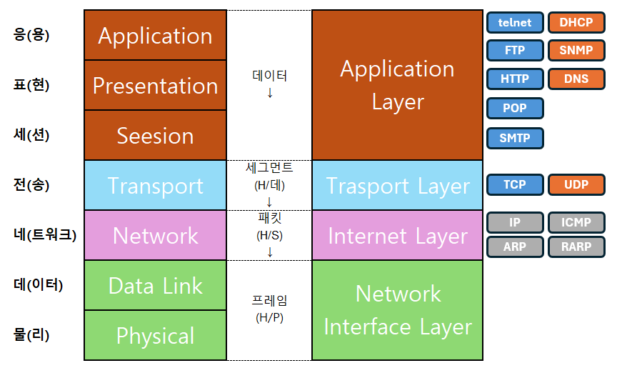 - ARP : IP 주소를 이용해 MAC주소를 알아내는 프로토콜