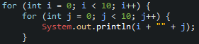 for(i) 아래 for(j)가 있는 상황으로 for(j)를 j++하며 j < 10까지 반복 후 i++실행 i < 10 까지 반복