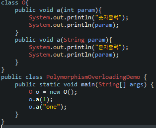 같은 메소드 명 'a'지만 매개변수 타입이 int와 String차이로