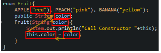 - 그 생성자를 Fruit(String color)의 매개변수 color에 들어감