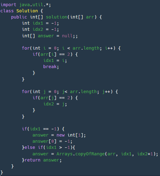 ※ 처음 풀었을 때 테스트 케이스 실패한 상황 : - idx1,2의 초기화값을 0으로 두었을 때 arr[0] == 2인경우 마지막 if문에 걸려서 -1을 반환하게됨 → 초기화값을 -1로 두었고 -1로 뒀을 때 else if문에서 Arrays.copyOfRange의 인덱스 시작범위가 음수가 되므로 에러가 발생 → elsif에 idx 가 0이상의 정수 조건을 검