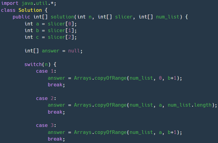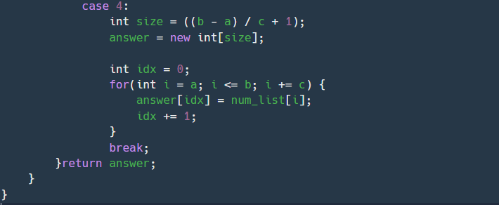 사용명령어 : switch문 어려웠던부분 : case 4에서 배열 answer의 크기를 지정하는 부분에 어려움이 있었음