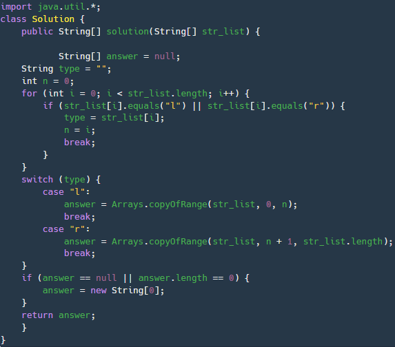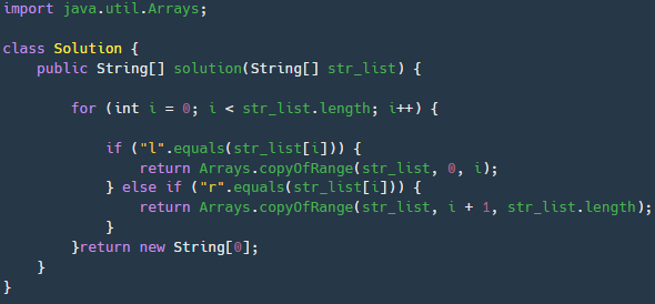 for문을 통해 "l"혹은"r"이 나오는 인덱스를 찾고 해당 인덱스가 발견되면 return을 통해 조건값을 바로 반환하여 메서드를 종료시킨다. 내가 작성한 for-break을 사용할 필요가 없으며 굳이 switch로 길게 작성할 필요 없이 if-else if로 해결 가능하다.