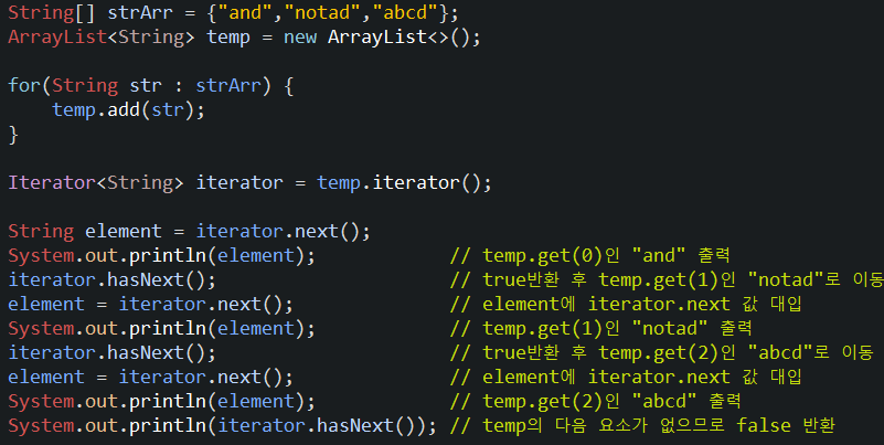 - 사용명령어 : iteraotr Iterator<String> iteraotor = temp.iterartor(); → 리스트 temp를 참조하여 iterator 객체 생성 iterator은 temp의 첫번째 요소를 가리킴 iterator.hasNext(); → iterator의 다음 요소가 있으면 true 출력 후 다음요소로 이동 iterator.next(); → iterator의 현재 요소 출력