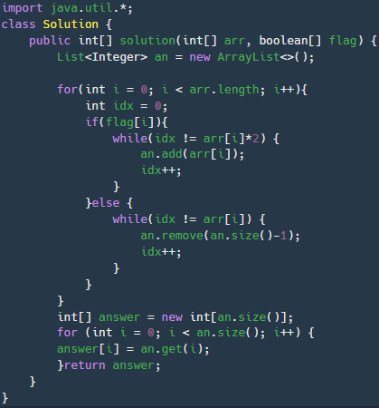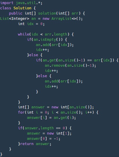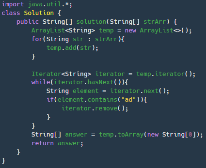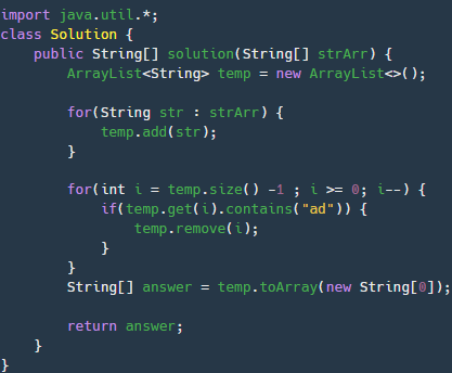 어려웠던부분 : 그냥 for문의 i를 1씩 증가시키면서 remove를 하면 remove되면서 temp의 index에 변동이 생겨 순환참조시에 문제가 발생되게된다. 이를 해결하기 위해 역순으로 i를 감소시키면서 for문을 실행한다. 다른방법 :