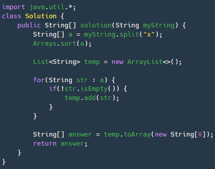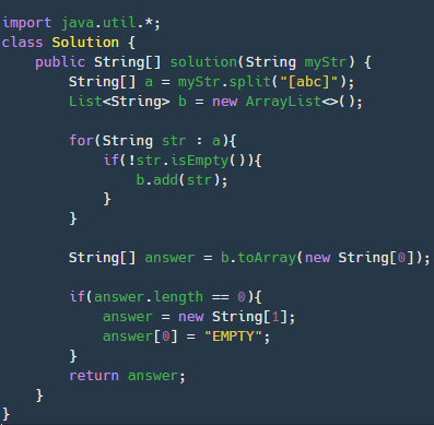 - 사용명령어 : str.split("c"); → 문자열 c 기준으로 나눈 배열 생성 List<String> str1 = new ArrayList<>(); str.isEmpty();