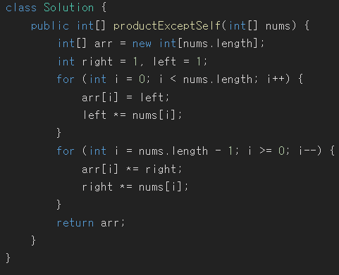- arr[1]에 left*nums[0]의 값을 대입하고 다시 left값에 nums[1]을 곱해줌