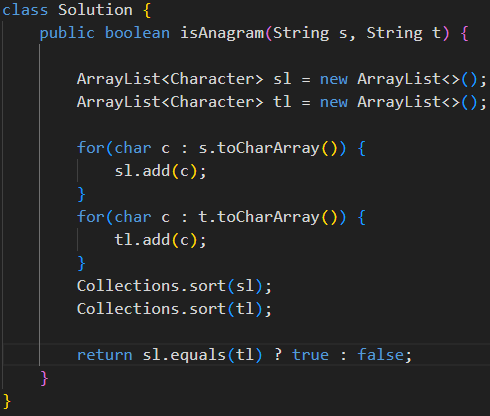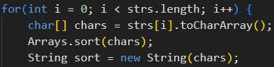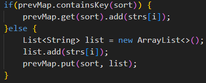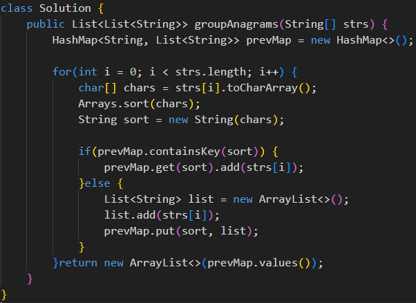 - HashMap 생성, key=정렬된 문자열, value=원래 문자열들의 리스트