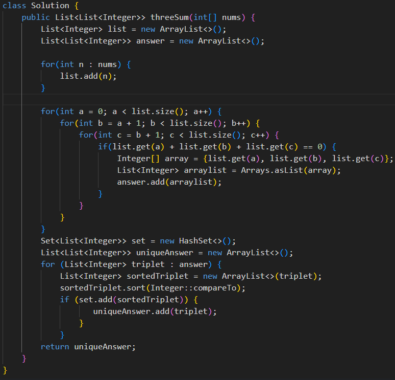 시간복잡도 O(n^3)를 가지는 비효율적인 코드다