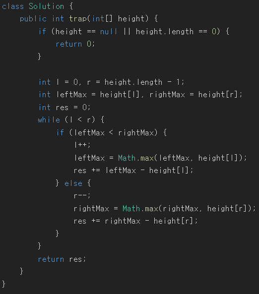 3. res값에 물이 들어갈 수 있는 공간(leftMax - height[l])을 더함