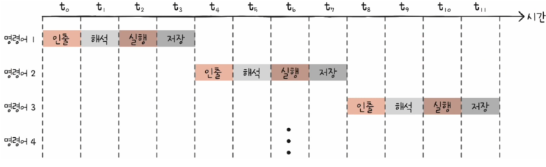 명령어 파이프라이닝 : CPU는 각 단계를 동시에 실행 할 수 있다.(t0에 인출이 2번일 수는 없다) 파이프라이닝을 하지 않을 시 파이프 라이닝 시