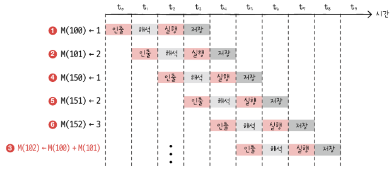 비순차적 명령어 처리 : 아래에서 3번 명령어를 처리하기 위해서는 1,2번 명령어가 실행이 끝날 때 까지 대기해야한다. 그러나 4~6번을 처리하기 위해서 위의 대기가 필요하진 않다.