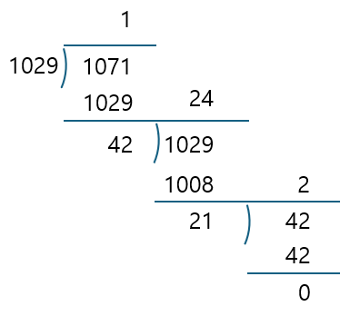 - 1071은 1029로 나누어 떨어지지 않기 때문에, 1071을 1029로 나눈 나머지를 구한다. ≫ 42