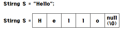 - 문자열은 문장의 끝에 문장의 끝을 확인하기위한 \0(널문자)가 들어간다.