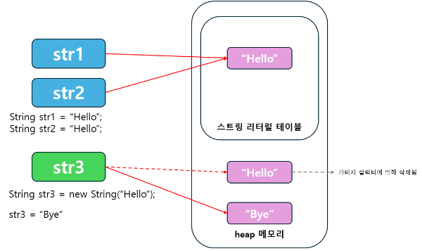 - 리터럴 방식 : 리터럴 방식은 heap 내부 String Constatn Pool을 먼저 조회해 없으면 생성하고 있다면 주소값을 참조함